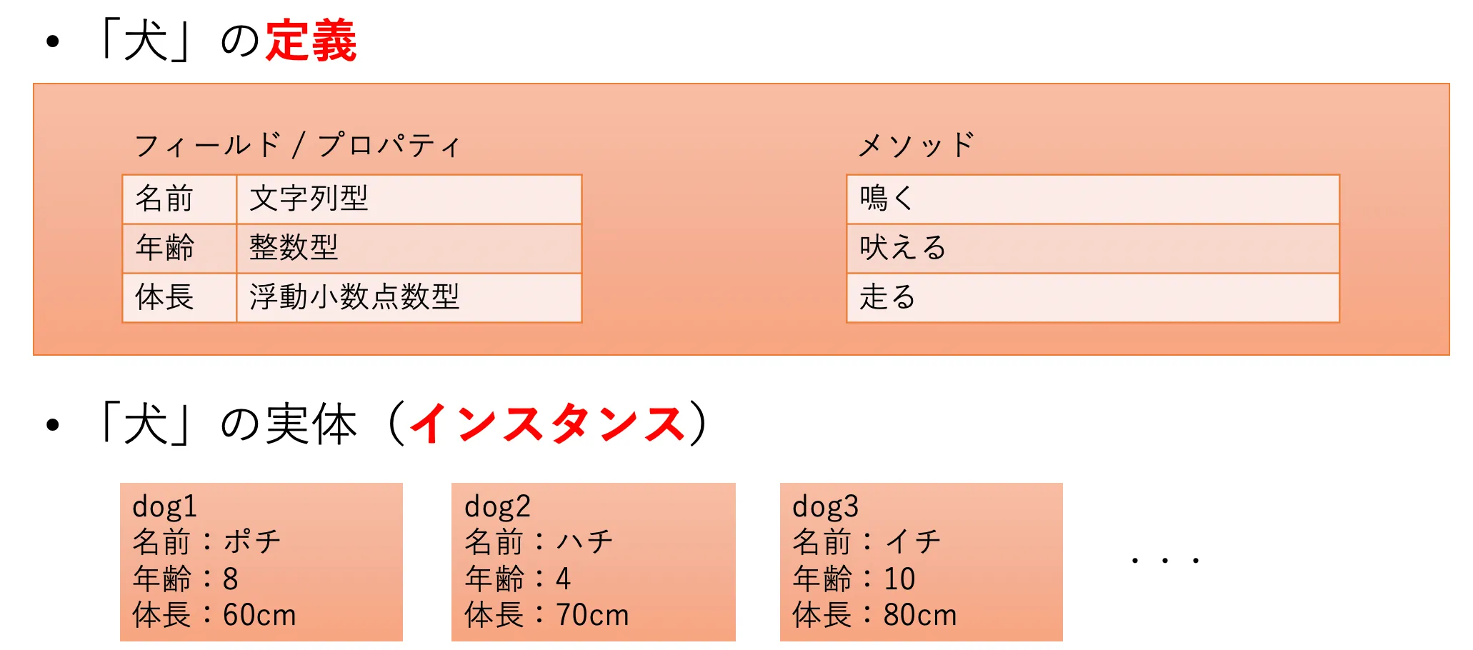 この定義をもとに作成された実体を、「インスタンス」と呼びます。これをプログラムで表現してみましょう。